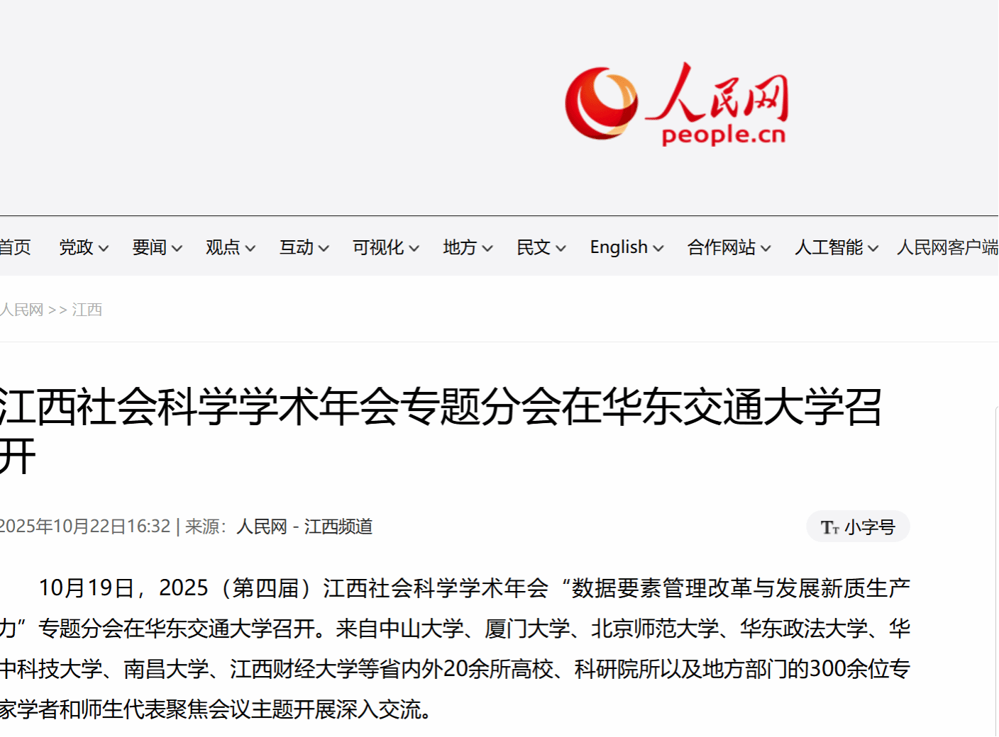 10月19日,2025(第四屆)江西社會科學學術年會“數據要素管理改革與發展新質生產力”專題分會在華東交通大學召開。來自中山大學、廈門大學、北京師范大學、華東政法大學、華中科技大學、南昌大學、江西財經大學等省內外20余所高校、科研院所以及地方部門的300余位專家學者和師生代表聚焦會議主題開展深入交流。