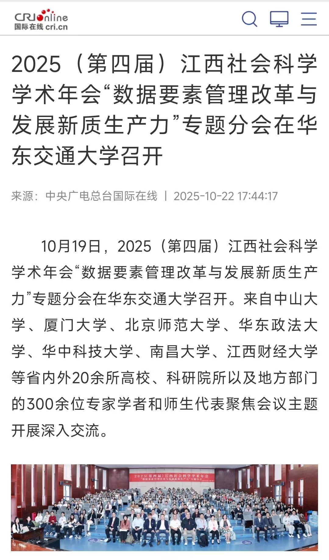 10月19日,2025(第四屆)江西社會科學學術年會“數據要素管理改革與發展新質生產力”專題分會在華東交通大學召開。來自中山大學、廈門大學、北京師范大學、華東政法大學、華中科技大學、南昌大學、江西財經大學等省內外20余所高校、科研院所以及地方部門的300余位專家學者和師生代表聚焦會議主題開展深入交流。