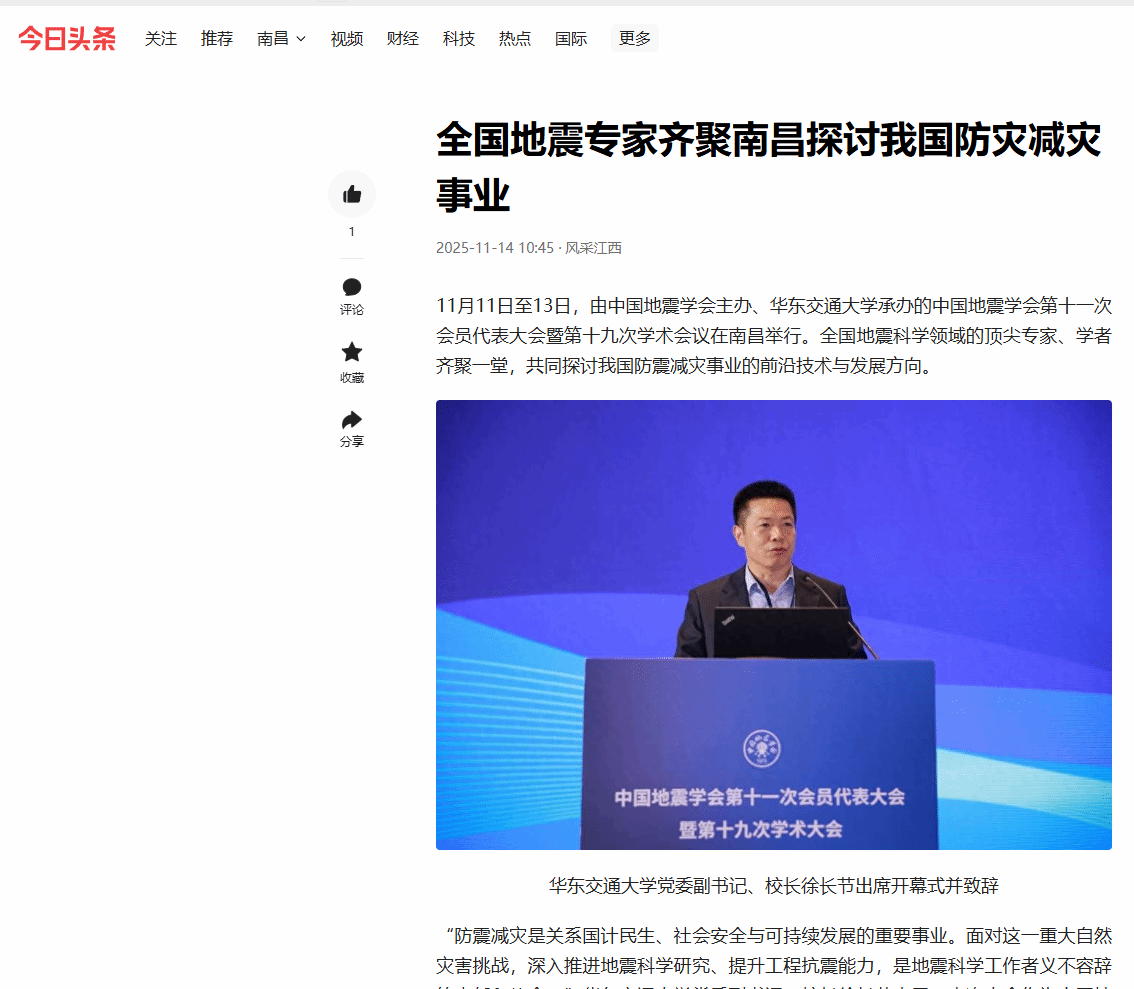 “防震減災是關系國計民生、社會安全與可持續發展的重要事業。面對這一重大自然災害挑戰,深入推進地震科學研究、提升工程抗震能力,是地震科學工作者義不容辭的責任和使命。”華東交通大學黨委副書記、校長徐長節表示,本次大會作為中國地震學會的重要學術盛會,為全國地震科學工作者搭建了高水平的學術交流與合作平臺,為推動學科交叉與協同創新提供了寶貴契機。