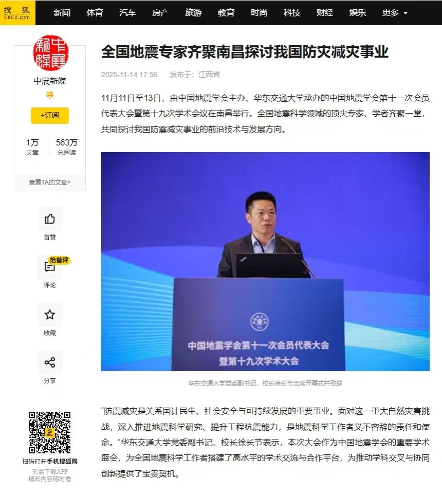 “防震減災(zāi)是關(guān)系國(guó)計(jì)民生、社會(huì)安全與可持續(xù)發(fā)展的重要事業(yè)。面對(duì)這一重大自然災(zāi)害挑戰(zhàn),深入推進(jìn)地震科學(xué)研究、提升工程抗震能力,是地震科學(xué)工作者義不容辭的責(zé)任和使命。”華東交通大學(xué)黨委副書(shū)記、校長(zhǎng)徐長(zhǎng)節(jié)表示,本次大會(huì)作為中國(guó)地震學(xué)會(huì)的重要學(xué)術(shù)盛會(huì),為全國(guó)地震科學(xué)工作者搭建了高水平的學(xué)術(shù)交流與合作平臺(tái),為推動(dòng)學(xué)科交叉與協(xié)同創(chuàng)新提供了寶貴契機(jī)。