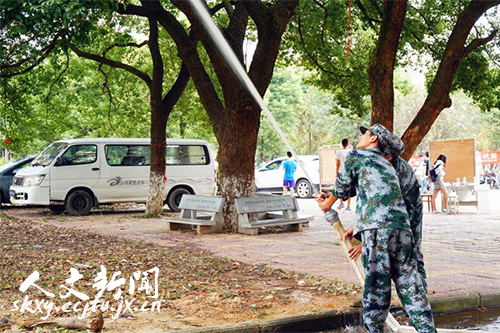 9月18日上午,為樹立2015級新生的消防安全意識,人文學院在北區一食堂門口舉行消防演練作為新生軍訓的“最后一課”。 隨著一聲“演練開始”,黃紅色的煙霧迅速籠罩了各樓層,食堂內新生用濕毛巾、濕紙巾或衣服等捂住...