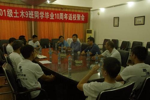 ??????9月12日,土木建筑學院舉行01級土木9班畢業十周年返校聚會。校對外聯絡處處長、校友工作辦公室主任羅侃,土木建筑學院黨委副書記吳昌林及相關任課老師出席座談會。 羅侃歡迎校友們返校聚會并介紹了學校...